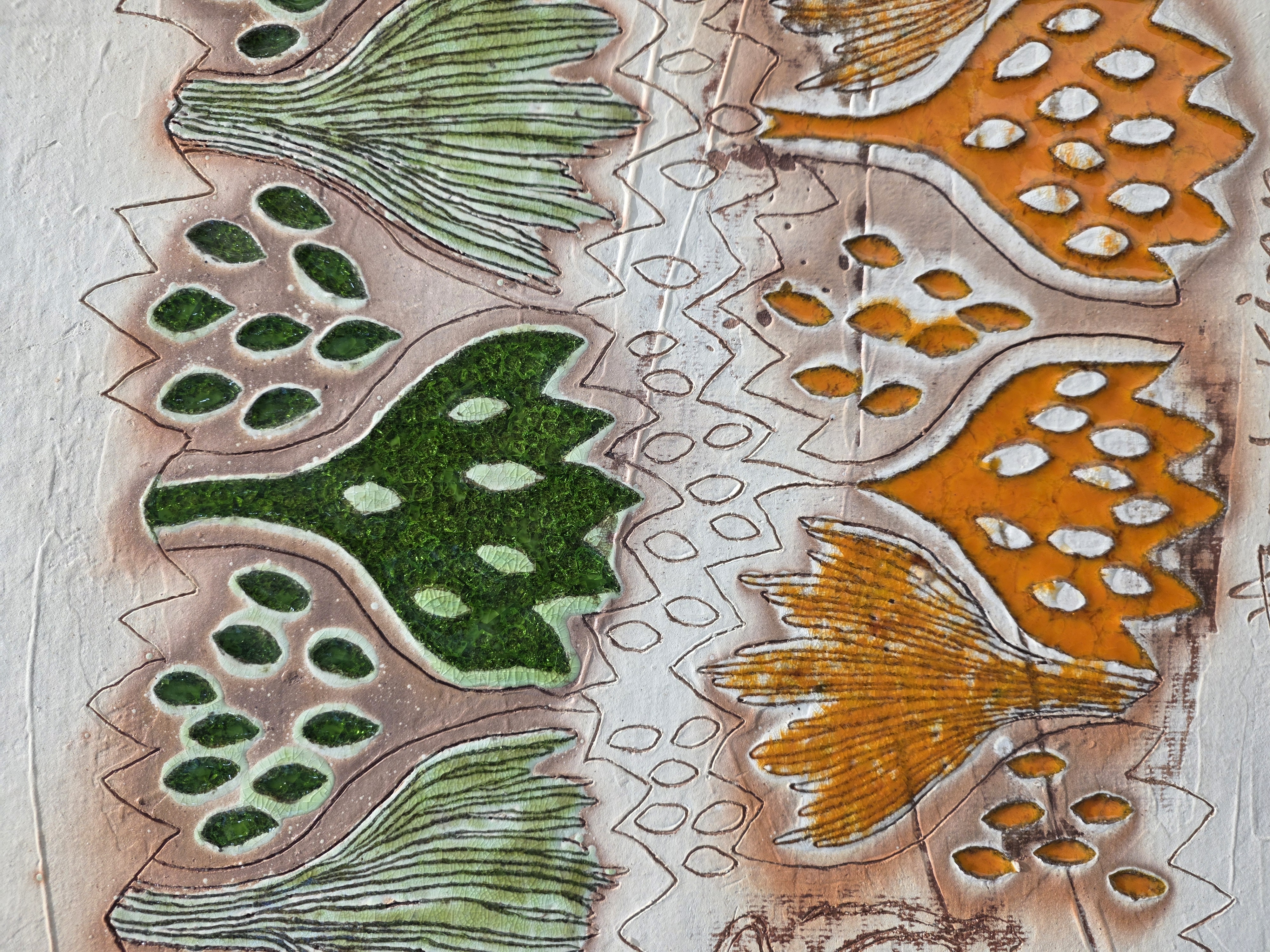 가마의 열기를 견디며 흘러내린 유리는 강렬한 색채로 표면에 고인다. 식는 과정에서 생겨난 미세한 빙열(crackle)은 불이 머물다 간 흔적이자, 찰나의 시간이 각인된 시간의 무늬다. 깨어난 빛은 무심하게 그어진 선들과 교차하며 환희와 긴장이 공존하는 감각의 장면을 만들어낸다.