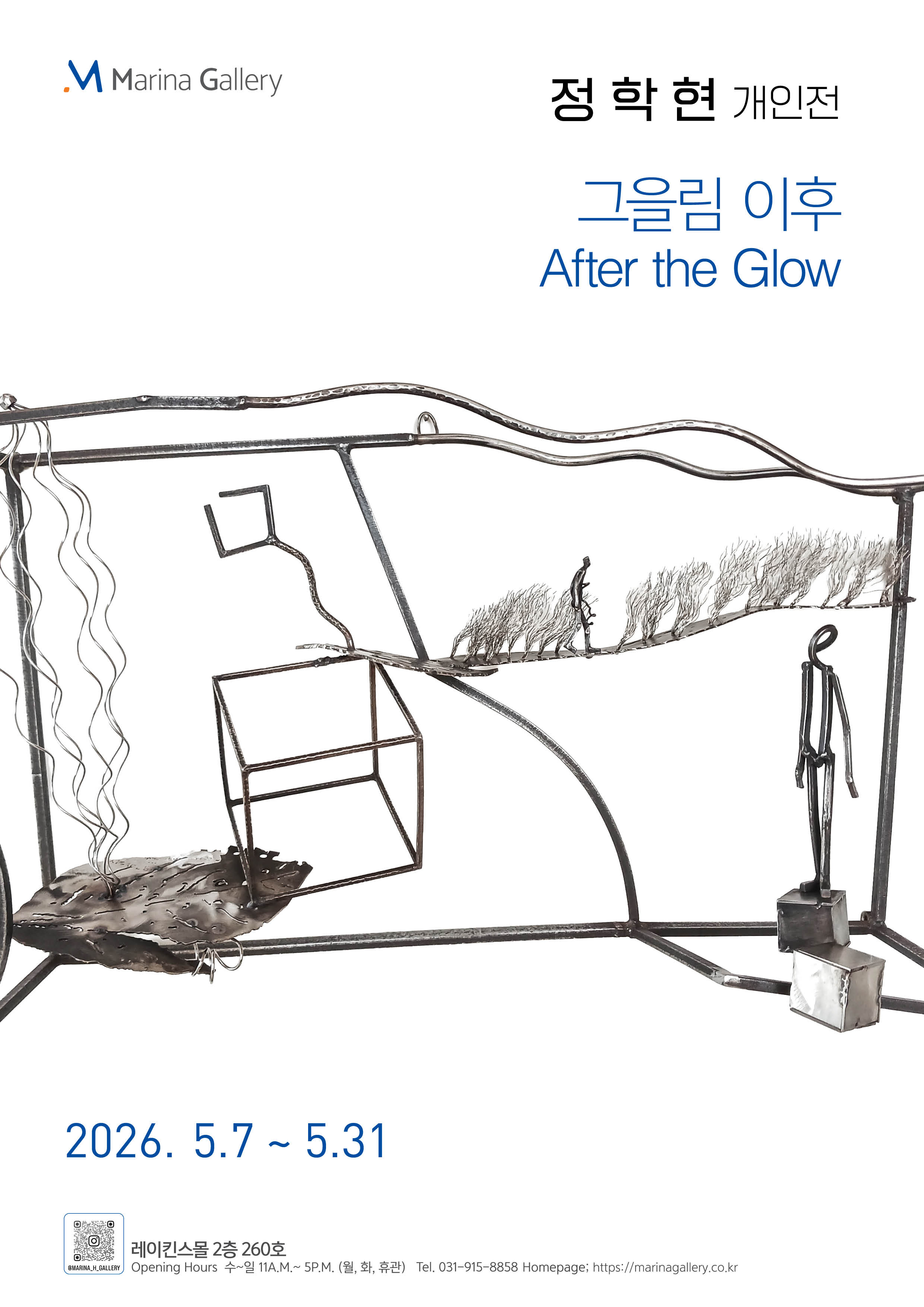 직선으로 구획된 차가운 세계 속에서 우리는 각기 다른 곡선을 그리며 살아간다. 〈그을림 이후〉는 그 궤적들이 스쳐 지나가는 자리에서, 단단한 물질 속에 깃든 인간의 부드러운 온기와 삶의 깊이를 드러낸다. 작업실의 고요한 불꽃이 만들어낸 이 은은한 빛(Glow)이, 5월의 마리나 갤러리를 찾는 이들의 마음에 따뜻한 위로로 가 닿길 바란다.