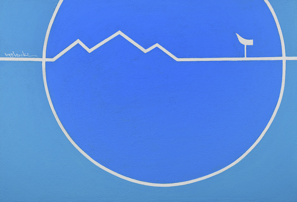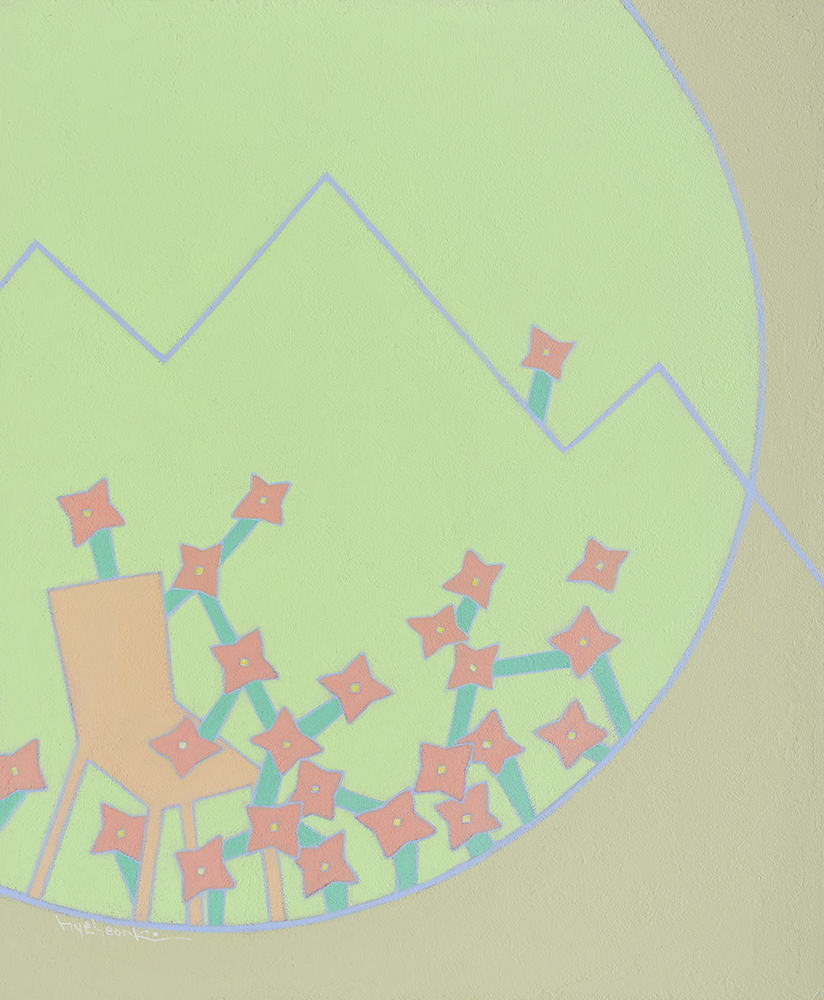 그동안 그려온, 사람들을 상징하던 집은 생략됐고 이제 캔버스 안에는 선으로 표현된 달과 산, 꽃으로 표현된 별, 그리고 의자만이 존재하게 되었다. 내가 신경 쓰며 집착했던 것들을 버리는 작업을 통해 비로소 진정한 쉼을 찾을 수 있게 된 것이다.
