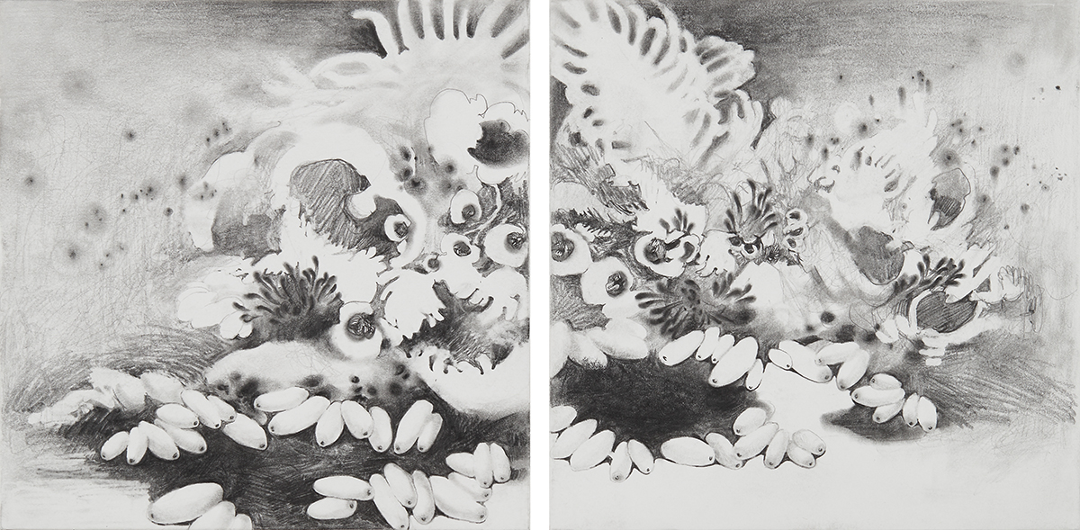 The screen, covered with tangled pencil lines and black graphite powder, is like a symphony played by an orchestra, where harmony and tension coexist, creating a self-sustaining ecology. The process of repeating drawing and erasing countless times fills and empties at the same time, creating a space that can accommodate something else. Just as I take the time to fill and empty while working, I hope that those who come to the exhibition hall will also be able to take the time to recharge and relax while appreciating the works.